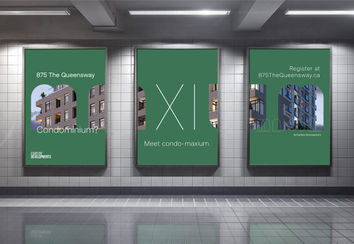 Notre objectif était de créer une marque pour le premier projet Maxium d’Equiton Developments, 875 The Queensway, qui se démarquerait sur le marché, susciterait la curiosité des gens à propos de Maxium, créerait un engouement pour les immeubles en copropriété de moyenne hauteur et consoliderait la réputation d’Equiton en tant que chef de file reconnu et digne de confiance dans le secteur du développement immobilier.
