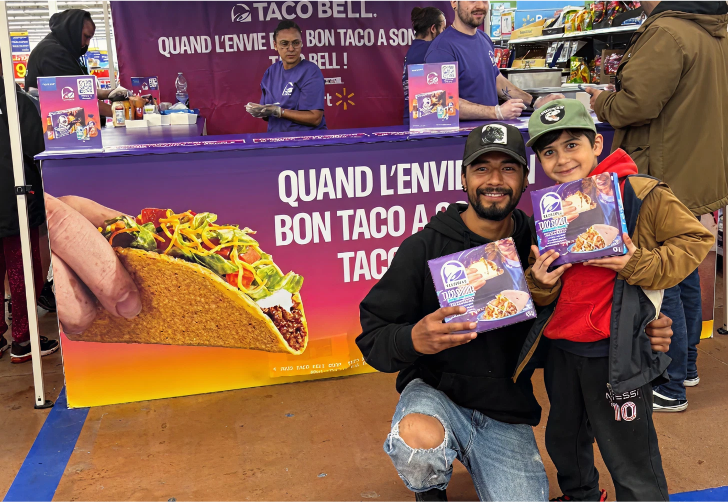 Taco Bell nous a mis au défi de promouvoir l’essai de ses nouvelles préparations à emporter, de renforcer la notoriété de la marque et de mettre en valeur ses saveurs emblématiques dans les magasins Walmart. L’expérience devait être attrayante, accessible et parfaitement intégrée aux magasins Walmart, tout en renforçant l’identité de la marque et le lien avec la société Coca-Cola.